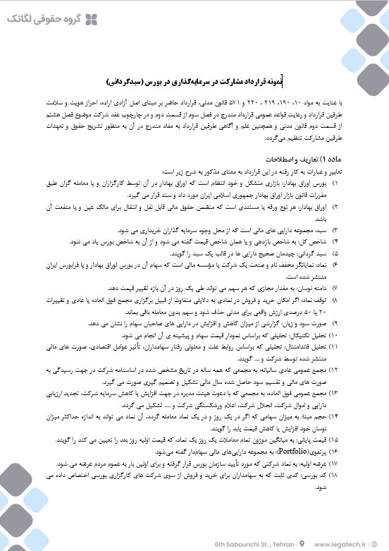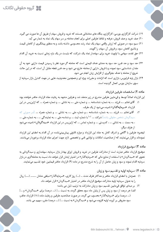 با این حال، مشارکت در این موضوع نیازمند تعیین و پیشبینی زیرساخت حقوقی لازم است تا از طریق آن حقوق و تکالیف طرفین به روشنی مشخص گردد. نمونه قرارداد مشارکت در سرمایهگذاری در بورس (سبدگردانی) به شما کمک میکند که تا حد امکان ریسکهای متناظر با این قرارداد را به حداقل برسانید و طرف قرارداد را به چهارچوب مشخصی ملتزم سازید.
