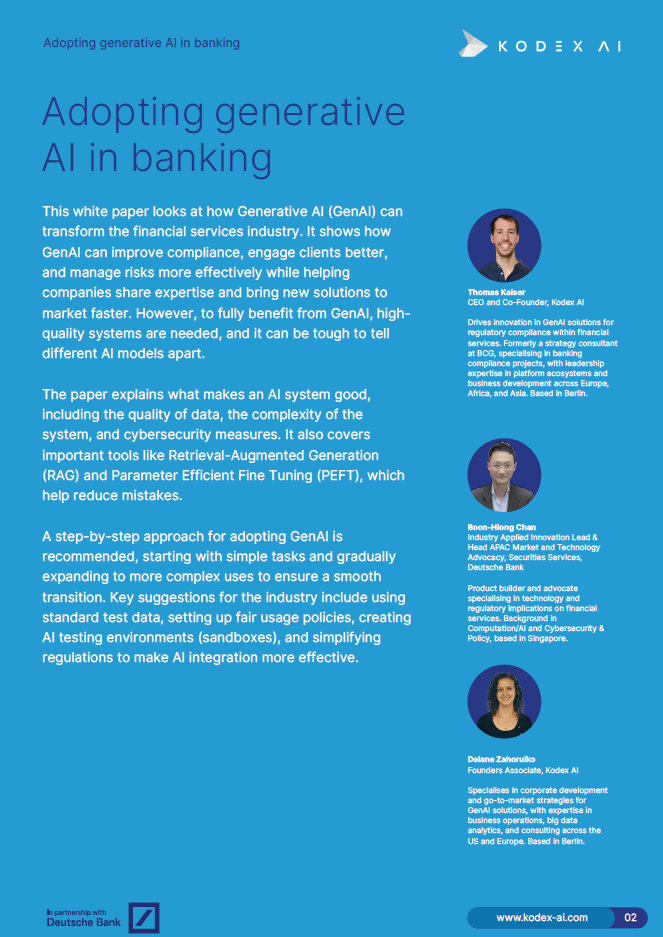 گزارش Adopting Generative AI in Banking بررسی میکند که چگونه هوش مصنوعی مولد (GenAI) میتواند صنعت خدمات مالی را متحول کرده و به بهبود انطباق، تعامل با مشتریان و مدیریت ریسک کمک کند. با افزایش بهرهوری و تسریع در ارائه راهحلهای نوآورانه، GenAI به مؤسسات مالی این امکان را میدهد که با چالشهای کنونی و آینده به نحو مطلوبی روبرو شوند.