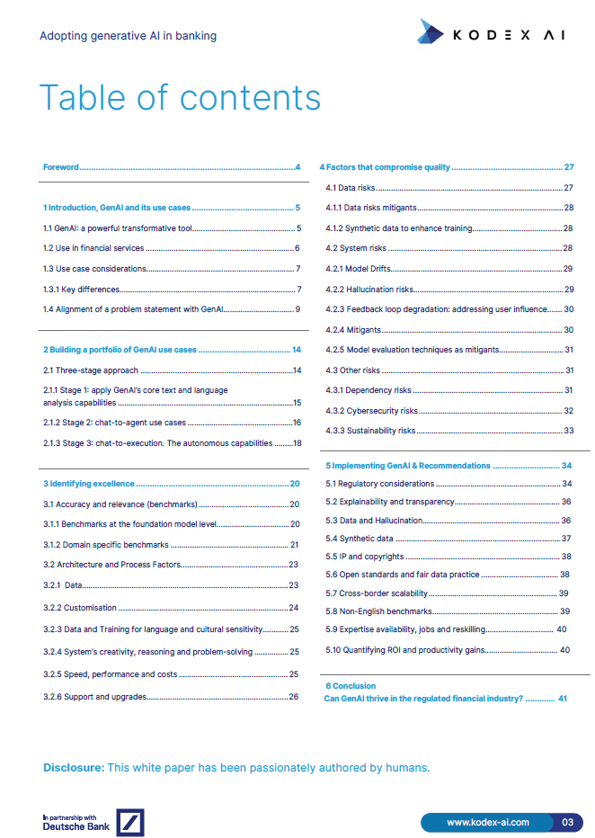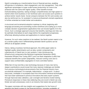 پذیرش GenAI نه تنها به افزایش کارایی و کیفیت خدمات کمک میکند، بلکه میتواند به تقویت اعتماد مشتریان و قدرت رقابتی سازمانها منجر شود. در نهایت، GenAI فرصتهای بینظیری را برای تحول در صنعت مالی فراهم میکند و به عنوان ابزاری برای تحقق نوآوری و بهبود عملکرد مؤسسات مالی عمل میکند.