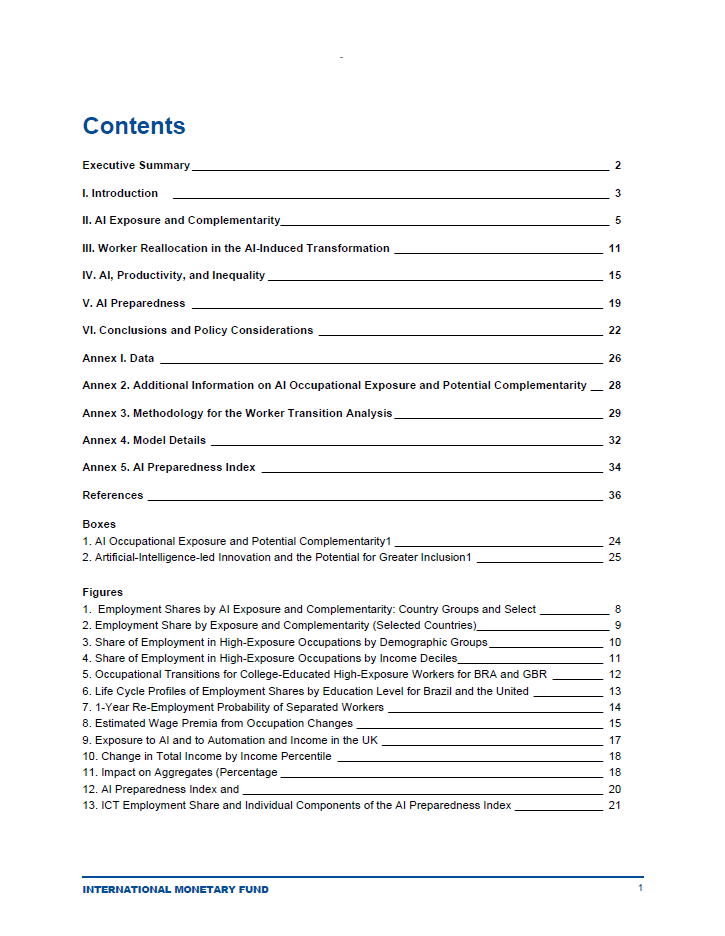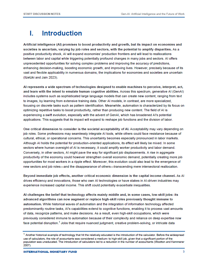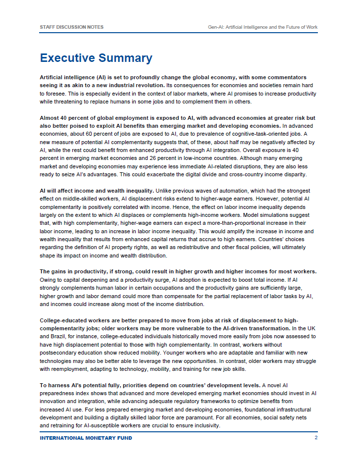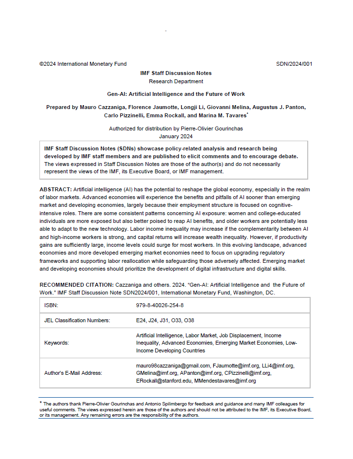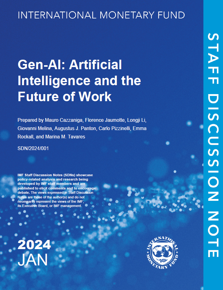 گزارش Gen-AI: Artificial Intelligence and the Future of Workتوسط صندوق بینالمللی پول (IMF) تهیه شده است. این موسسه بینالمللی به منظور ارتقاء همکاریهای مالی و اقتصادی جهانی و تسهیل تجارت بینالمللی تأسیس شده است. صندوق بینالمللی پول با ارائه مشاورههای اقتصادی، تأمین مالی و کمکهای فنی به کشورهای عضو، به بهبود ثبات اقتصادی و رشد پایدار در سطح جهانی کمک میکند.