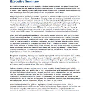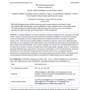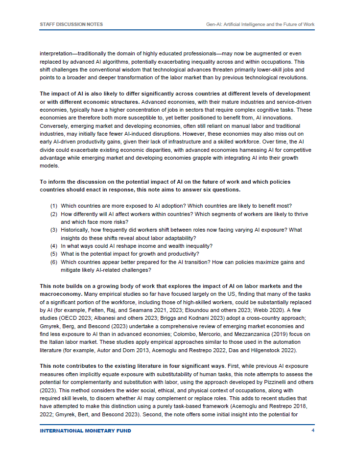 گزارش Gen-AI: Artificial Intelligence and the Future of Work (ژِن-ایآی: هوش مصنوعی و آینده کار) به بررسی تأثیرات هوش مصنوعی (AI) بر بازار کار جهانی میپردازد. این گزارش بهویژه بر روی تغییرات ساختاری که هوش مصنوعی در مشاغل و درآمدها ایجاد میکند، تمرکز دارد. با توجه به پیشرفتهای سریع در فناوریهای هوش مصنوعی، این گزارش به تحلیل چالشها و فرصتهایی میپردازد که این فناوری برای کشورهای مختلف، به ویژه کشورهای پیشرفته و در حال توسعه، به همراه دارد.