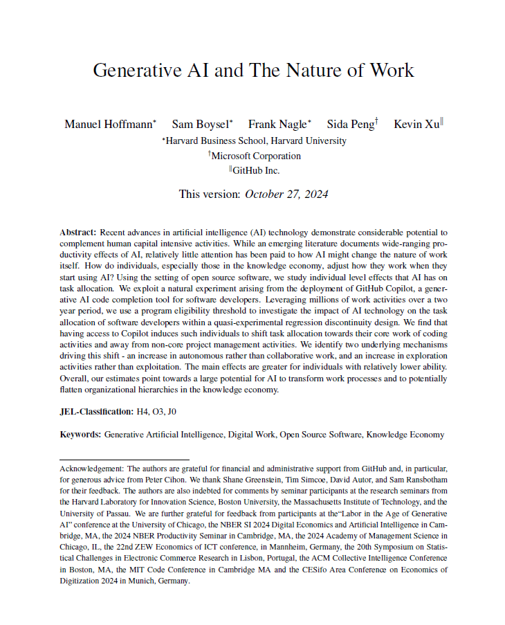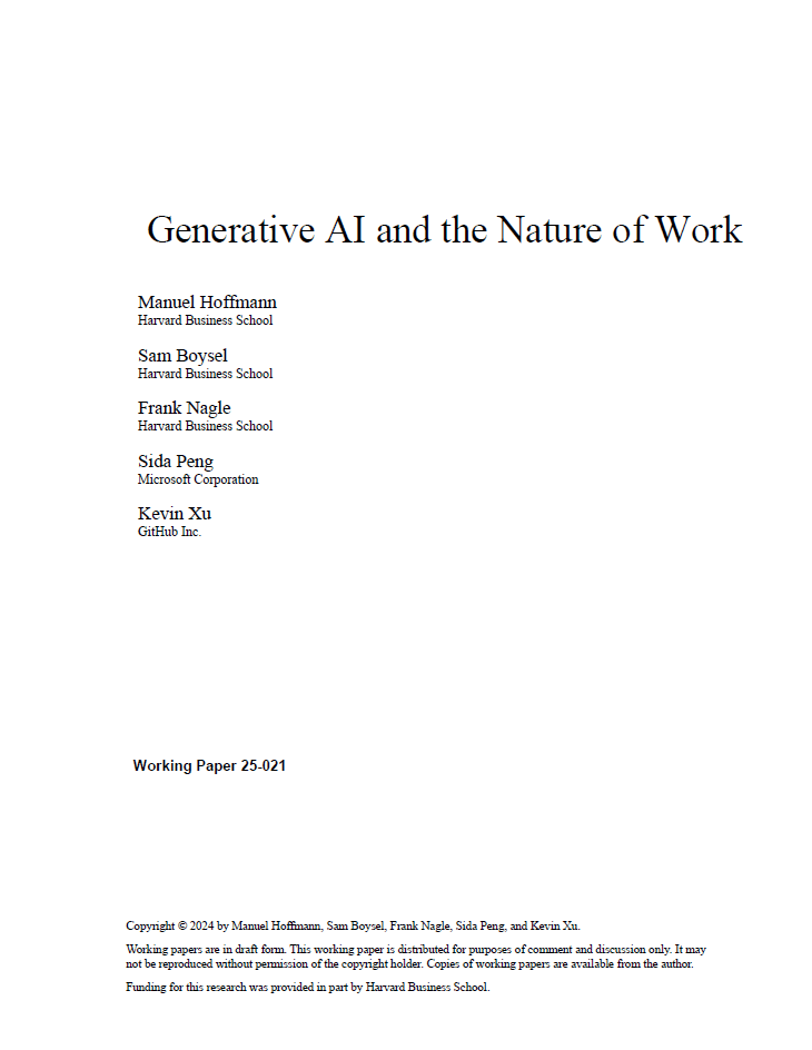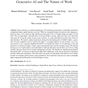 این گزارش تحت عنوان “Generative AI and the Nature of Work” توسط گروهی از محققان از دانشگاه هاروارد و شرکتهای مایکروسافت و گیتهاب نوشته شده است. هدف اصلی این تحقیق بررسی تأثیرات هوش مصنوعی مولد (Generative AI) بر نحوه کار افراد، به ویژه در زمینه نرمافزارهای متنباز (Open Source Software) است. در ادامه، خلاصهای از سرفصلها و نتایج کلیدی این گزارش ارائه میشود.