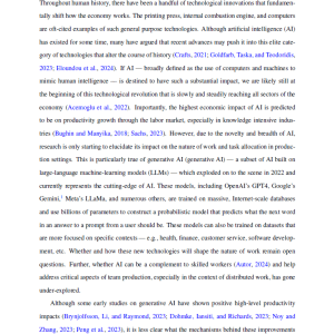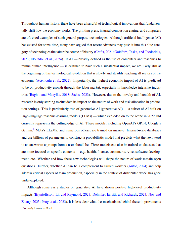 – گزارش به بررسی تأثیرات هوش مصنوعی بر رشد بهرهوری و تغییرات در ساختار کار میپردازد. با توجه به پیشرفتهای اخیر در فناوری هوش مصنوعی، این تحقیق به دنبال درک چگونگی تغییر نحوه کار افراد در اقتصاد دانش است.