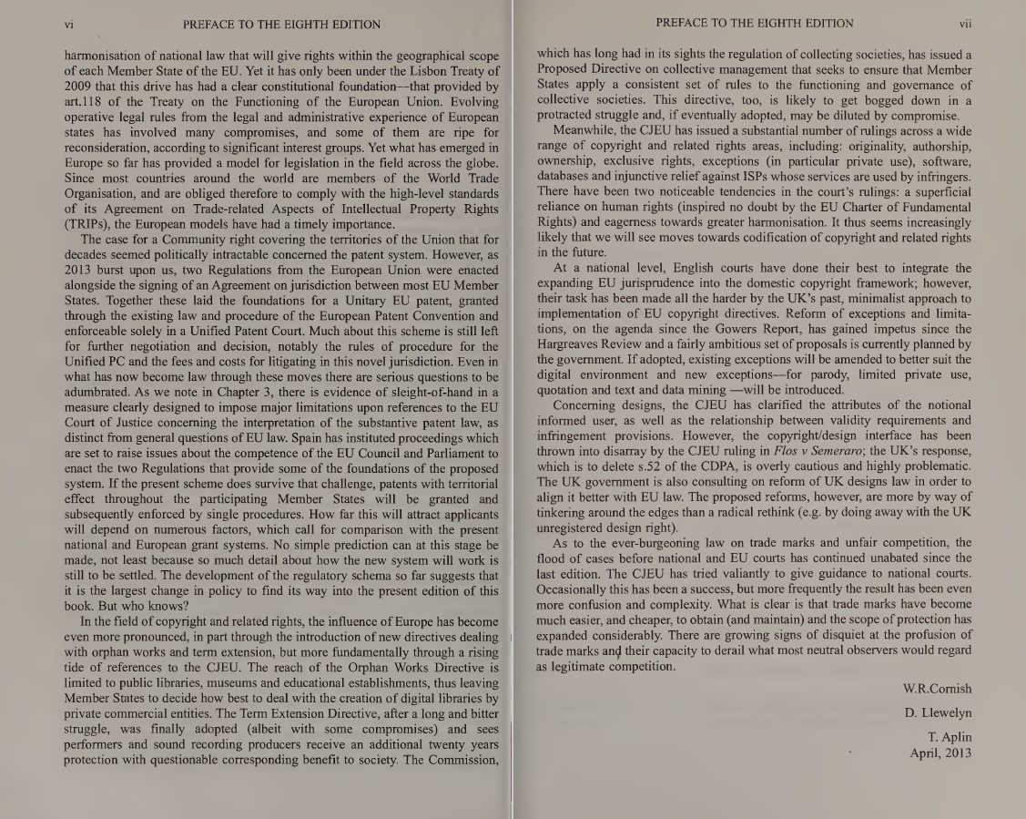 کتاب حقوق مالکیت فکری (Intellectual Property Law) نوشته W.R. Cornish، D. Llewelyn و T. Aplin، یک منبع جامع و معتبر در زمینه حقوق مالکیت فکری است که به بررسی قوانین و مقررات مربوط به این حوزه میپردازد. این کتاب بهویژه برای دانشجویان و وکلا که به دنبال درک عمیقتری از حقوق مالکیت فکری هستند، بسیار مفید است. با توجه به تحولات جدید در فناوری و اینترنت، این کتاب به تحلیل چالشها و فرصتهای جدید در زمینه حقوق مالکیت فکری میپردازد و بهعنوان یک منبع کلیدی در این حوزه شناخته میشود.