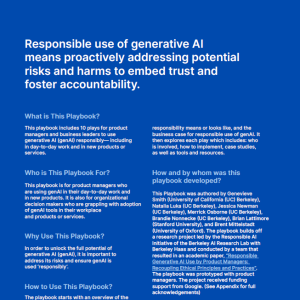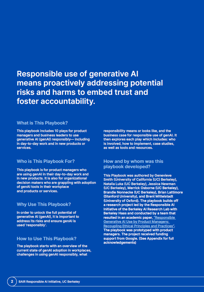 گزارش استفاده مسئولانه از هوش مصنوعی (Responsible Use of AI) توسط موسسه BAIR (Berkeley AI Research) در دانشگاه کالیفرنیا، برکلی تهیه شده است. این موسسه با هدف تحقیق و توسعه در زمینه هوش مصنوعی و مسئولیت‌های اخلاقی مرتبط با آن فعالیت می‌کند. تیم تحقیقاتی این موسسه متشکل از پژوهشگران و استادان برجسته‌ای است که در زمینه‌های مختلف هوش مصنوعی و اخلاقیات آن تخصص دارند.