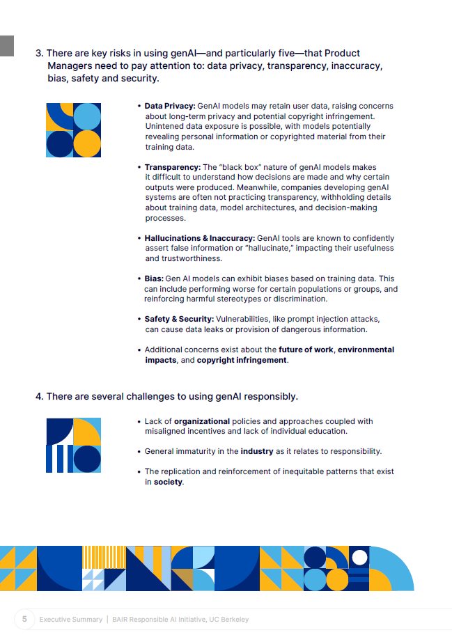 موضوع اصلی گزارش استفاده مسئولانه از هوش مصنوعی (Responsible Use of AI) به بررسی چالش‌ها و فرصت‌های استفاده از هوش مصنوعی در محیط‌های کاری و محصولات جدید می‌پردازد. با گسترش روزافزون فناوری‌های هوش مصنوعی، نیاز به استفاده مسئولانه از این ابزارها بیش از پیش احساس می‌شود. این گزارش شامل ۱۰ بازی (play) برای مدیران محصول و رهبران سازمانی است که می‌توانند به استفاده ایمن و مسئولانه از هوش مصنوعی کمک کنند.