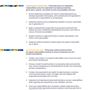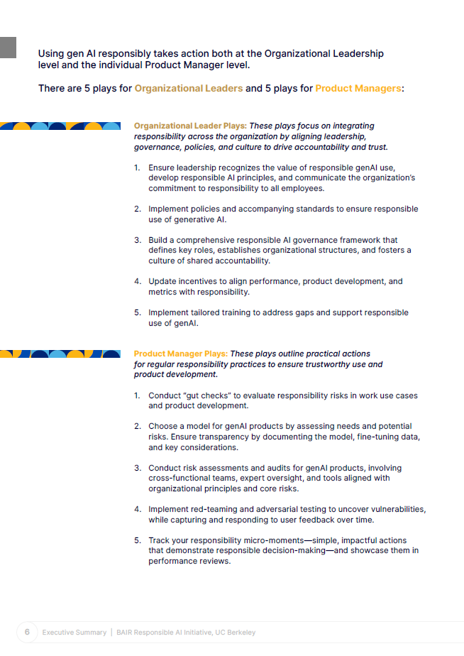 گزارش استفاده مسئولانه از هوش مصنوعی (Responsible Use of AI) شامل پنج بازی برای رهبران سازمانی و پنج بازی برای مدیران محصول است. این بازی‌ها به شرح زیر هستند:
