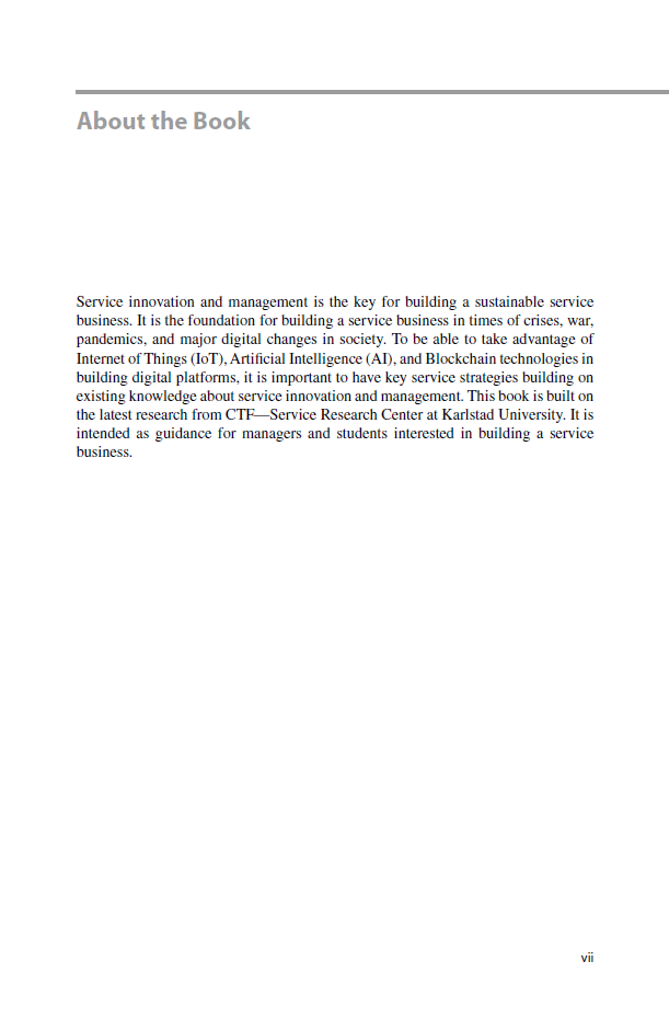 کتاب «نوآوری و مدیریت خدمات» (Service Innovation and Management) در پی پاسخ به چالشهای بهوجود آمده در دنیای جدید خدمات است. این کتاب با ارائه ترکیبی از مدلهای نظری و ابزارهای مدیریتی، کسبوکارها را برای موفقیت در چشمانداز مدرن خدمات آماده میکند. توانایی انطباق با پیشرفتهای دیجیتال، تغییرات اجتماعی و نیاز به پایداری از مواردی است که این کتاب به آنها پرداخته و به خوانندگان کمک خواهد کرد تا در دنیای پیچده امروز موفق باشند.