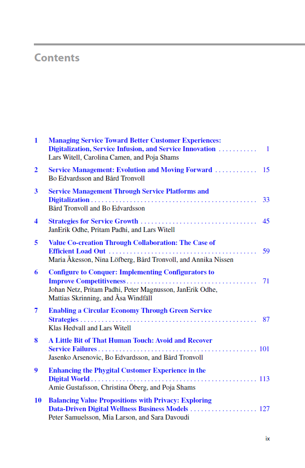 این فصل توسط لارس ویتل و همکارانش نوشته شده و به معرفی یک مدل مدیریت خدمات میپردازد که چگونگی مقابله با چالشهای دیجیتالیزاسیون و نوآوری خدمات را برای سازمانها توضیح میدهد. همچنین اهمیت ایجاد ارزش برای مشتریان و پیشنهادات شفاف را مورد تأکید قرار میدهد.