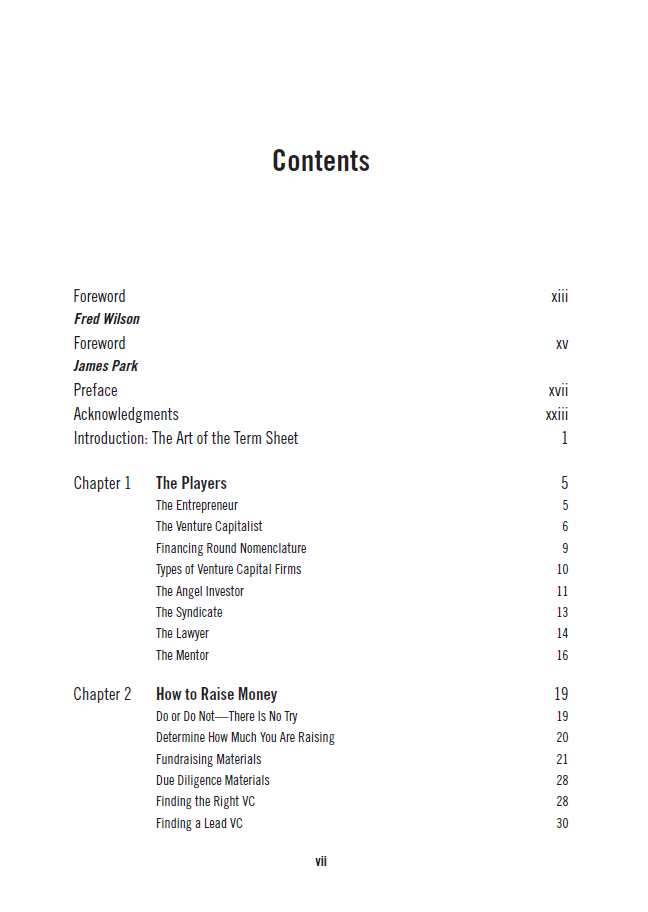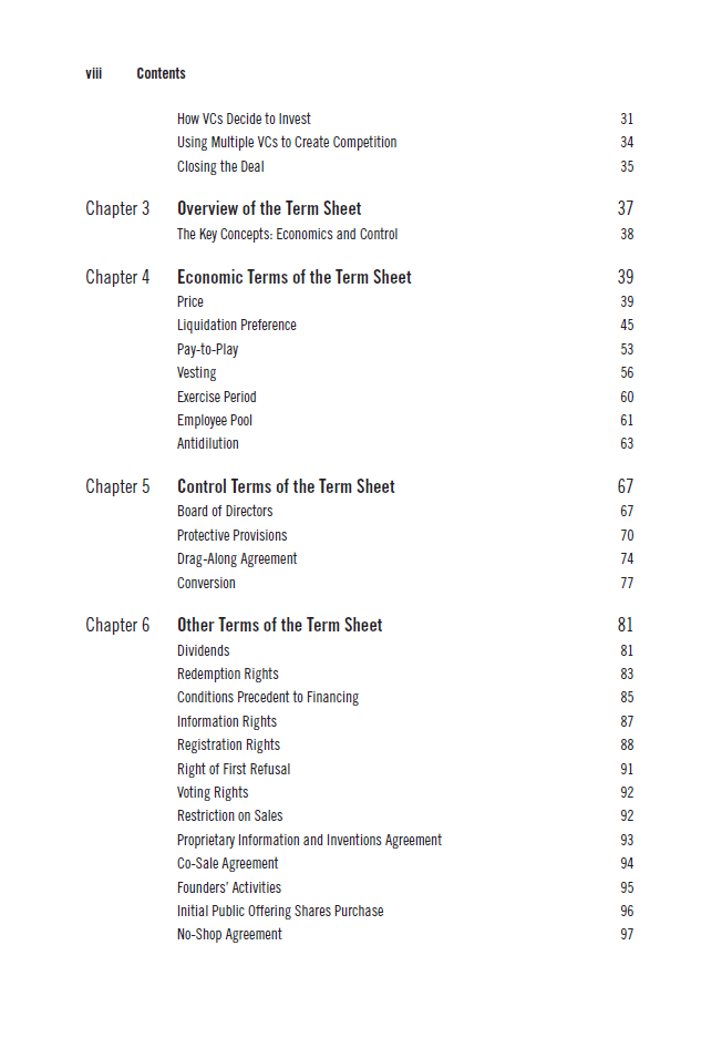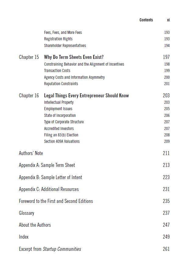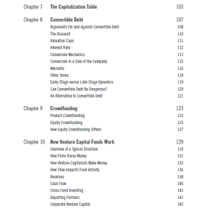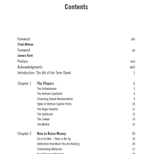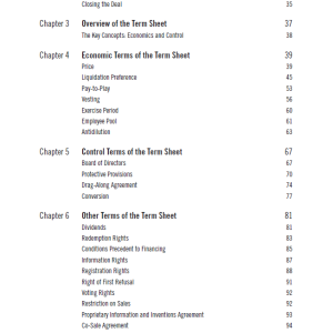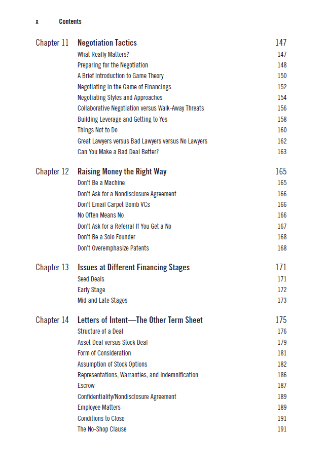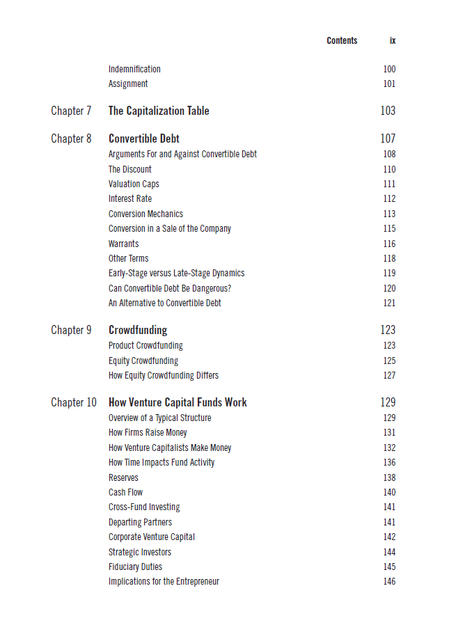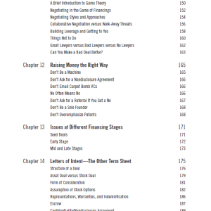 این فصل به بررسی نحوه تنظیم قراردادها و توافقات میان کارآفرینان و سرمایه‌گذاران می‌پردازد. نویسندگان نکات کلیدی در مورد نحوه نوشتن قراردادهای مؤثر و جلوگیری از مشکلات حقوقی را ارائه می‌دهند. آن‌ها به بررسی اصطلاحات رایج در قراردادها، مانند حقایق و ضمانت‌ها، و همچنین شرایط مالی و اقتصادی می‌پردازند.