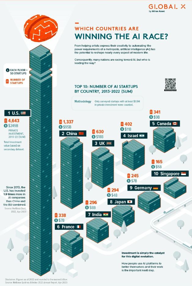 ایالات متحده و چین در سرمایهگذاری هوش مصنوعی (AI) پیشرو هستند. از سال 2013، ایالات متحده نزدیک به 250 میلیارد دلار در 4643 شرکت هوش مصنوعی سرمایه گذاری کرده است. تنها در سال 2022، 524 استارتاپ جدید مبتنی بر هوش مصنوعی در ایالات متحده تاسیس شد که 47 میلیارد دلار سرمایه جذب کرد. از سوی دیگر، چین بالاترین میانگین سرمایهگذاری شرکتها را در استارتآپهای مبتنی بر هوش مصنوعی در سال ۲۰۲۲ داشت و هر یک از ۱۶۰ استارتآپ جدید آن بهطور میانگین ۷۱ میلیون دلار دریافت کردند.